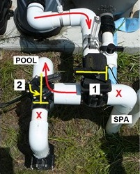 شکل بالا، مسیر جریان آب را در صورت باز بودن شیر بای پس نشان می دهد. در این حالت، آب از داخل فیلتر و دستگاه کلرزن نمکی عبور کرده و وارد استخر و جکوزی می شود. درواقع، شیرهای قرار گرفته در این مسیر، میزان انعطاف پذیری بالای سیستم را نشان میدهد. با قرار دادن وضعیت شیرهای موجود در سیستم لوله کشی، می توان هیترها را در مسیر قرار داد یا از مدار خارج کرد و همینطور میزان آب برگشتی به استخر و جکوزی را نیز تنظیم نمود.
