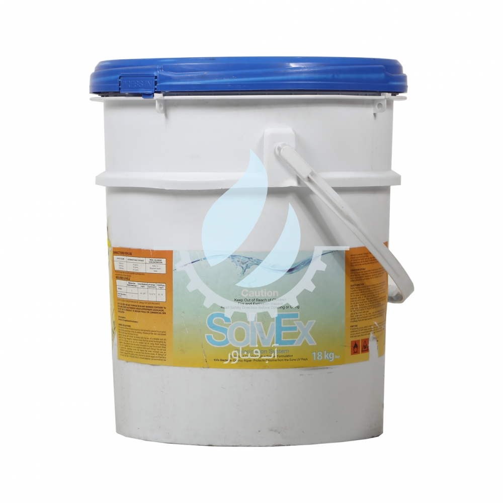 پودر کلر Solvex در بسته های 18 کیلوگرمی جهت استفاده در فرآیند کلرزنی استخر و صنعتی، با فرمولاسیون مخصوص و ماندگاری بالا در مقابل تابش نور خورشید، جهت ضدعفونی و از بین بردن باکتری و جلبک