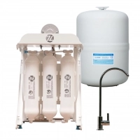 دستگاه تصفیه آب خانگی شش مرحله ای اینلاین ZZ مدل Premium Plus با روش اسمز معکوس با روش اسمز معکوس پایه دار به ظرفیت 75 گالن در شبانه روز،مجهز به پمپ، ممبران و مخزن تحت فشار تایوانی، شیر سینک اهرمی بلند، مراحل تصفیه شامل یک فیلتر پلی پروپیلن فشرده 5 میکرون، فیلتر کربن گرانول، فیلتر پلی پروپیلن فشرده 1 میکرون، ممبران RO، فیلتر کربن پودری کپسولی و فیلتر مینرال