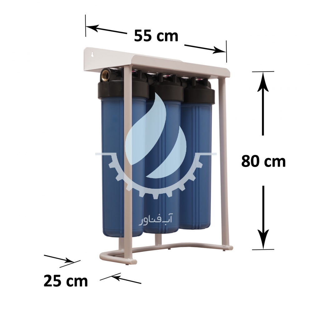 پکیج پیش تصفیه جامبو سه مرحله ای با هوزینگ های درجه یک وارداتی، با استند فلزی به همراه فیلترهای پلی پروپیلن و کربن جهت حذف ذرات معلق، کلر، مواد آلی و همچنین بهبود طعم و بوی آب